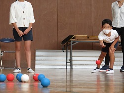 10月12日(水)パラスポーツ指導員の方々を講師にお招きし,「ボッチャ体験」を行いました。「ボッチャ」とはヨーロッパ発祥のスポーツで,ジャックボール(目標球)の白いボールに赤・青のそれぞれ6球ずつのボールを投げたり,転がしたり,他のボールに当てたりして,いかに近づけられるかを競います。