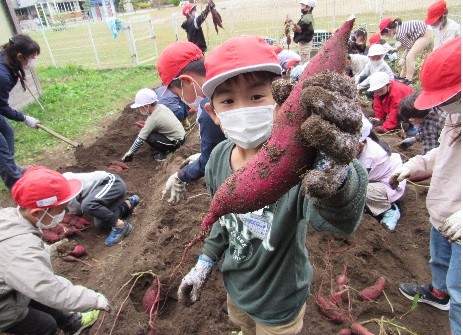 1年生が育てた芋を収穫しました。芋をまるで宝探しのように芋を掘り出す様子は、とても楽しそうでした。どれも大きく育ち、大豊作でした。