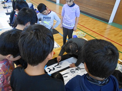 先生の指導を受けながら、どの児童も真剣に書き初め練習に取り組むことができました。