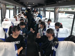 只今席替え真っ最中です。宿には5時半ごろ到着予定です。バスの中ではレク係が盛り上げてくれるので、笑い声が絶えません。