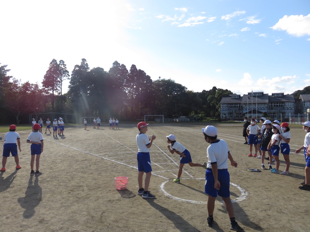 秋空まぶしい日となりました。本日は、外で行うソフトボール投げと50m走の2種目に6年生が取り組みました。