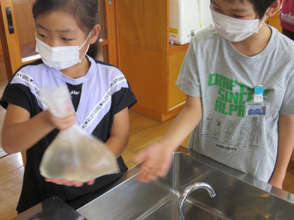 2年生では、「かさ」の学習をしています。本時は、実際に水の量を測る学習を行いました。ビニール袋に目分量で水を入れ、どれくらいが1Lなのかを考えたり、鍋やヤカンにおおよそどのくらいの水が入るか予想を立てて、水を入れたりしました。
