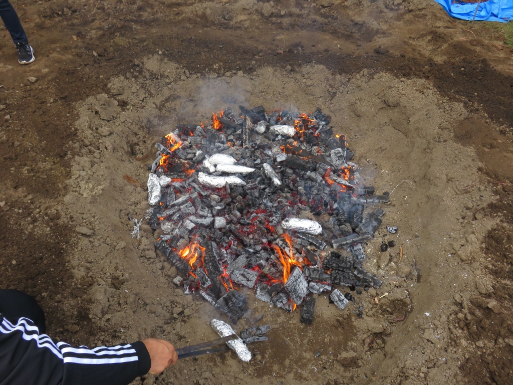 1年生が、収穫したサツマイモで焼きいもをしました。水を染み込ませた新聞紙とアルミホイルでサツマイモを包み、準備をしました。火は、校長先生たちが準備をしてくれました。温まった木炭の中にサツマイモを入れ、教室で完成を待ちました。