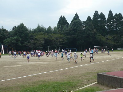 外での避難の様子。迅速にグラウンド中央へ避難できました。