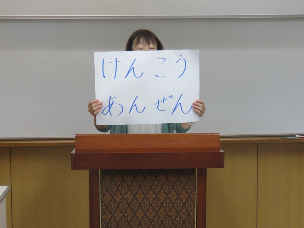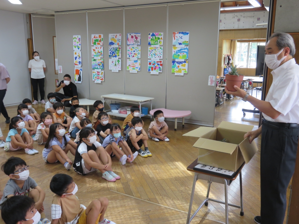 終業式では、パイナップルを手にした校長先生から、「夏休み中に何かに挑戦してほしい」というお話がありました。また、生徒指導主任の先生からは、交通事故や熱中症に気を付けるようお話がありました。