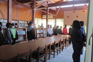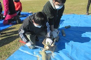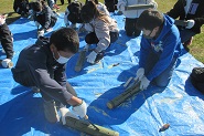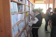 修学旅行の代替行事として、旧老川小学校で様々な活動を行いました。初めに、大多喜小学校に隣接する竹林の竹を使って、ばちで叩いて音を出すスリットドラムという楽器をつくりました。竹は固く、のこぎりで溝を切り取ることに苦戦しましたが、苦労した分、完成の喜びが大きく、竹のもつあたたかさにも触れ、ご満悦の表情でした。次に「捨てないくらし、譲りあうくらし」をテーマに、旧老川小学校で毎月開催されている「あおぞら市」に対する思いを聞いたり、「あおぞら市」で貸し出す本を選書したりしました。また、旧老川小学校で行っている「養蜂」についても学びました。