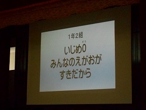 事前に各学級で「いじめをなくすために私ができること」について話し合い、いじめ根絶の標語を作りました。