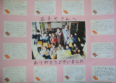 先日まち探検で、1・2年生が玉子屋製菓に見学に行きいろいろとお世話になり、そのお礼のメッセージを届けました。児童が一生懸命に書いたメッセージを、お店の人は大喜びで受け取ってくれました。