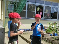 1年生が生活科の学習でシャボン玉遊びを行いました。
