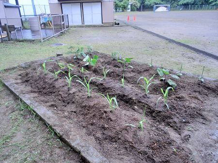 6月14日(火)に、2年生が生活科の授業でトウモロコシ、ナス、キュウリ、トマト、オクラの苗を、心を込めて丁寧に植えました。「無事に育ちますように。」