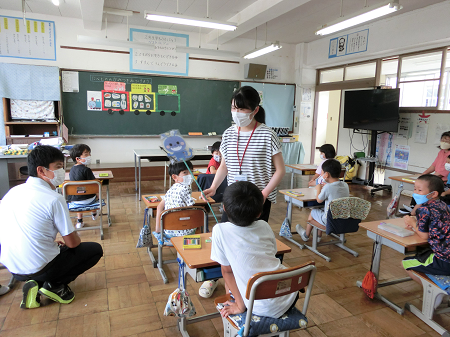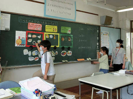 6月21日(火)に、1・2年生を対象に食育教室が開かれました。栄養教諭の先生が来校し、「たべもののひみつをみつけよう」のテーマで、健康な体を作るために必要な栄養素について、楽しく学習しました。