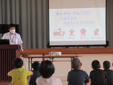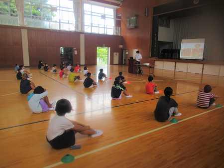 7月20日(水)の5校時に、1学期の終業式を行いました。校長先生から7月までの行事等での児童の活躍をプロジェクターで示しながら振り返りました。これから始まる42日間の夏休みは、「ふだんできないことにチャレンジして、安全・健康面に十分注意して過ごしましょう。」とのお話がありました。