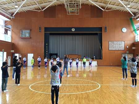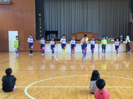 19日(水)に予定されている地区サッカー大会の壮行会が行われました。3年生以上の11名の選手が一人ずつ決意を発表し、模擬試合をしてくれました。ミニバス部の代表や校長先生から、「最後まであきらめずに、大きな声を出して試合をしてください。」と励ましの言葉をいただきました。