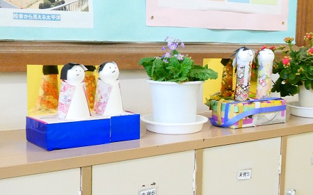 豊浜小学校玄関に1年生が作ったかわいいお雛様が飾られています。
