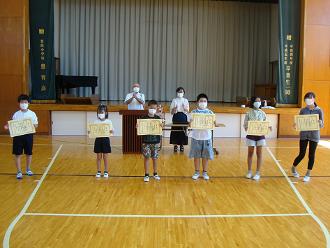 9月の始業式は、コロナ感染症の緊急事態宣言下のためオンラインで行いましたが、10月の全校集会は、久しぶりに体育館に全校児童を集めて行いました。賞状伝達も行い、全校で称え合うことができました。