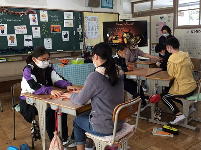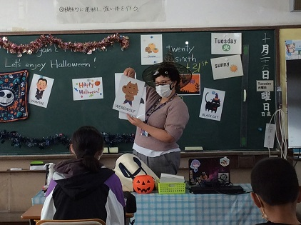 2人のALTの先生がハロウインにちなんだ楽しい授業をしてくださいました。ゲームやビデオ,ダンス等先生と児童たちとで盛り上がりました.。授業の最後には『Trick or Treat 』と言って先生から素敵なシールをプレゼントされました。