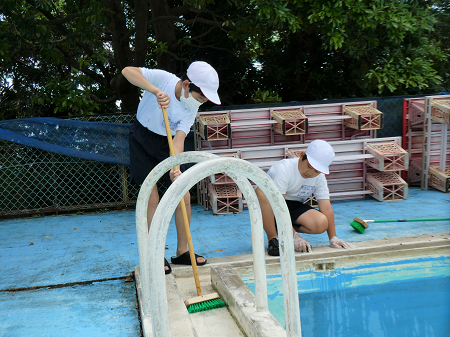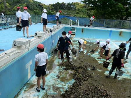 6/22(水)~7/15(金)の水泳指導に向けて、3年生から6年生が、プールや更衣室・トイレ等の清掃を行いました。ドロの中にヤゴやオタマジャクシもいるので教室に持ち帰り、学習にいかされます。また、業者の方も数日前のプールの水抜きの時から関わってくださいました。
