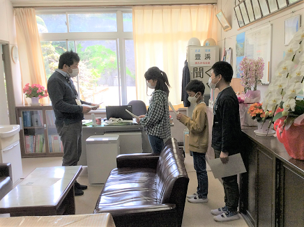4月19日(火)に、5年生が外国語の授業を行いました。今年度着任された校長先生に英語で自己紹介をした後、自分で作成した英語版の名刺を校長先生に渡して名刺交換をしました。児童の皆さんは緊張したと思いますが、良い経験となりました。