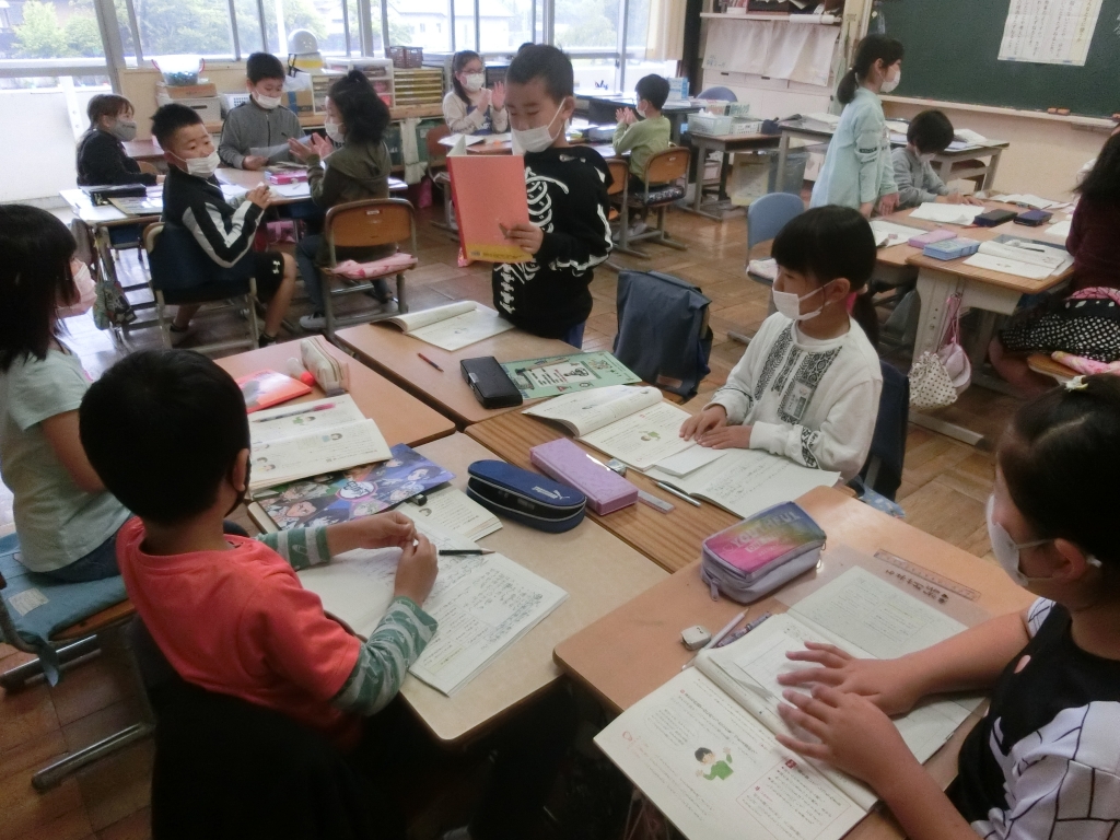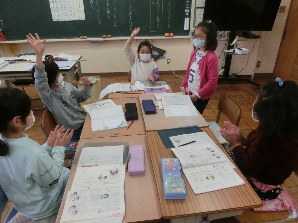 3年生が国語の授業で、友だちの話をよく聞き、もっと知りたいことを質問する学習を行いました。班ごとに真剣に友達の話を聞きながら、疑問に思ったことや、もっと詳しく聞きたいことなどを、質問します。