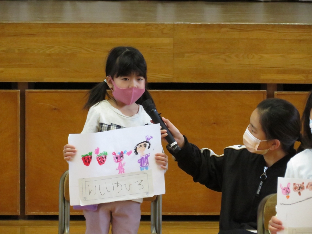 「1年生へのインタビュー」では、大きな声で自分の名前や好きな食べ物を答えることができました。