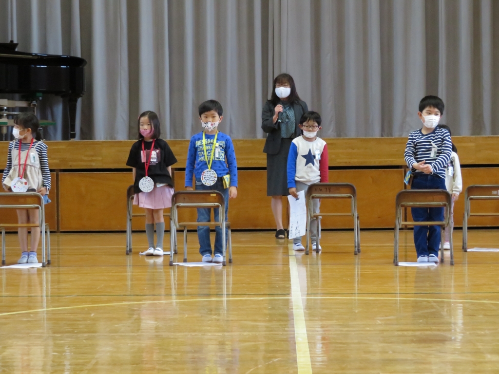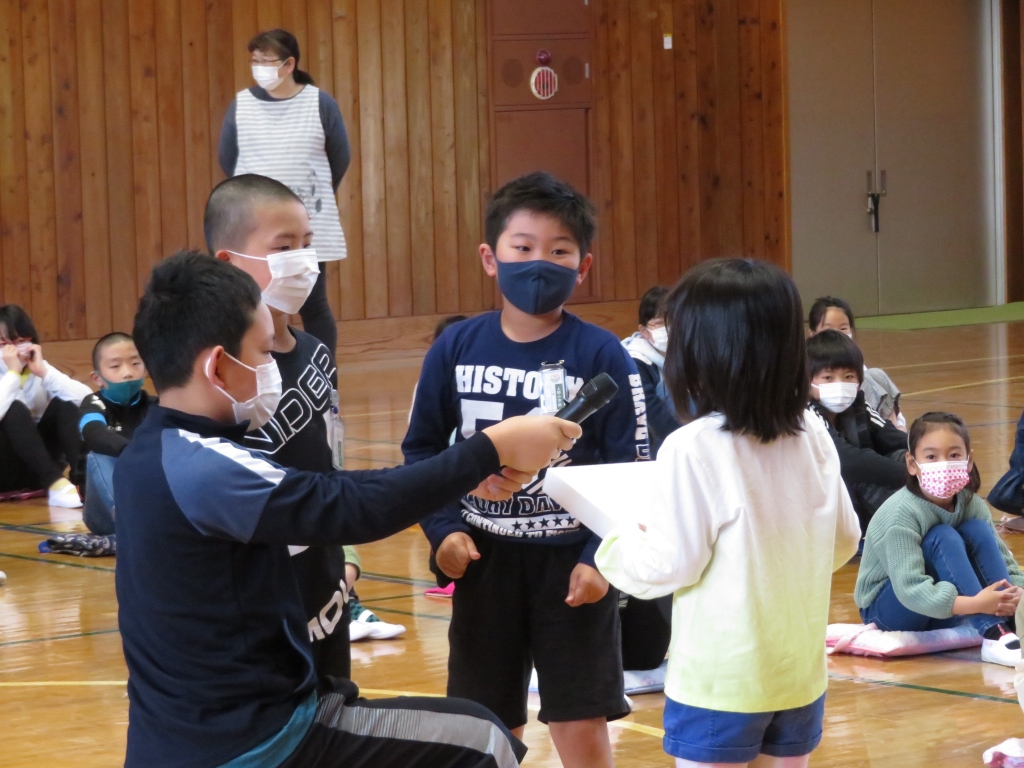 2年生から、1年生の時に育てたあさがおとひまわりの種が、3年生からは、似顔絵やメッセージが書かれた手作りのメダルがプレゼントされました。
