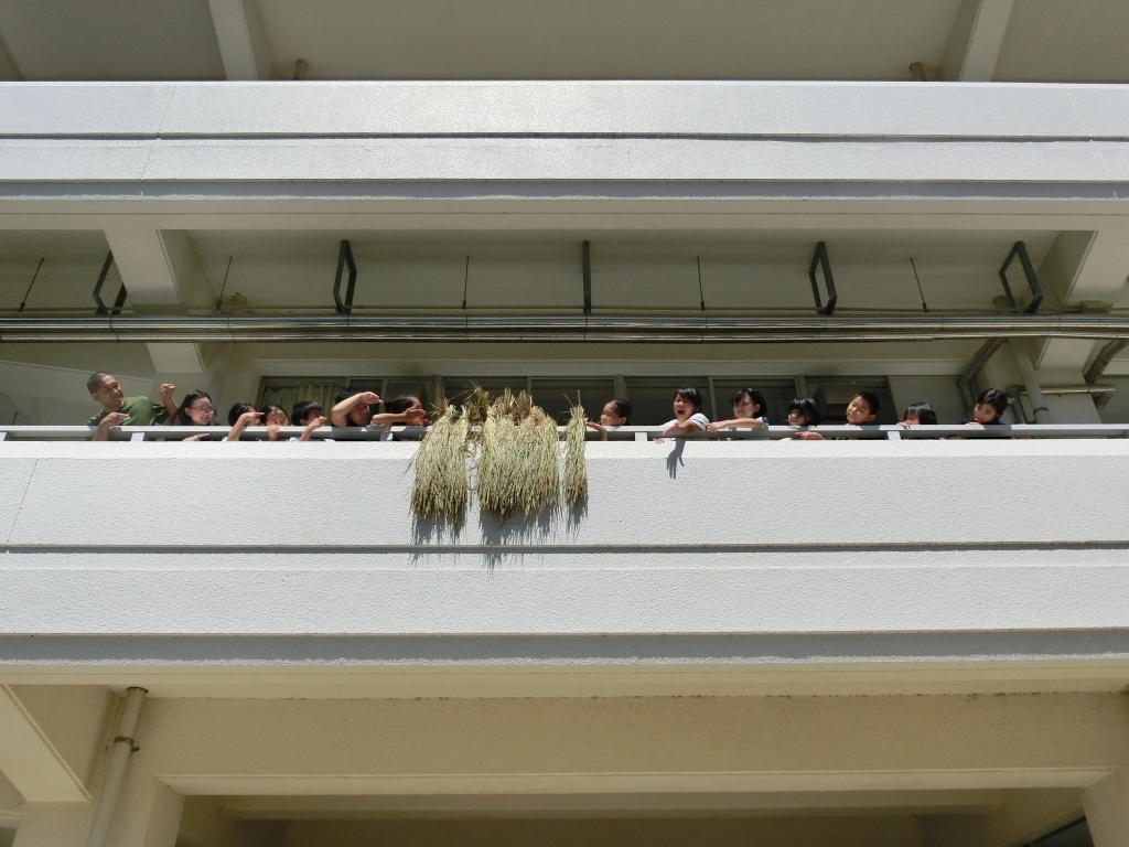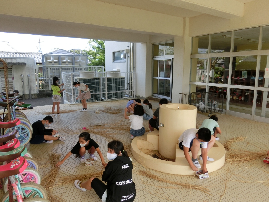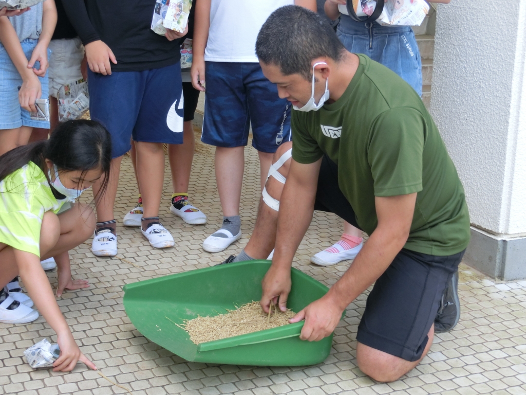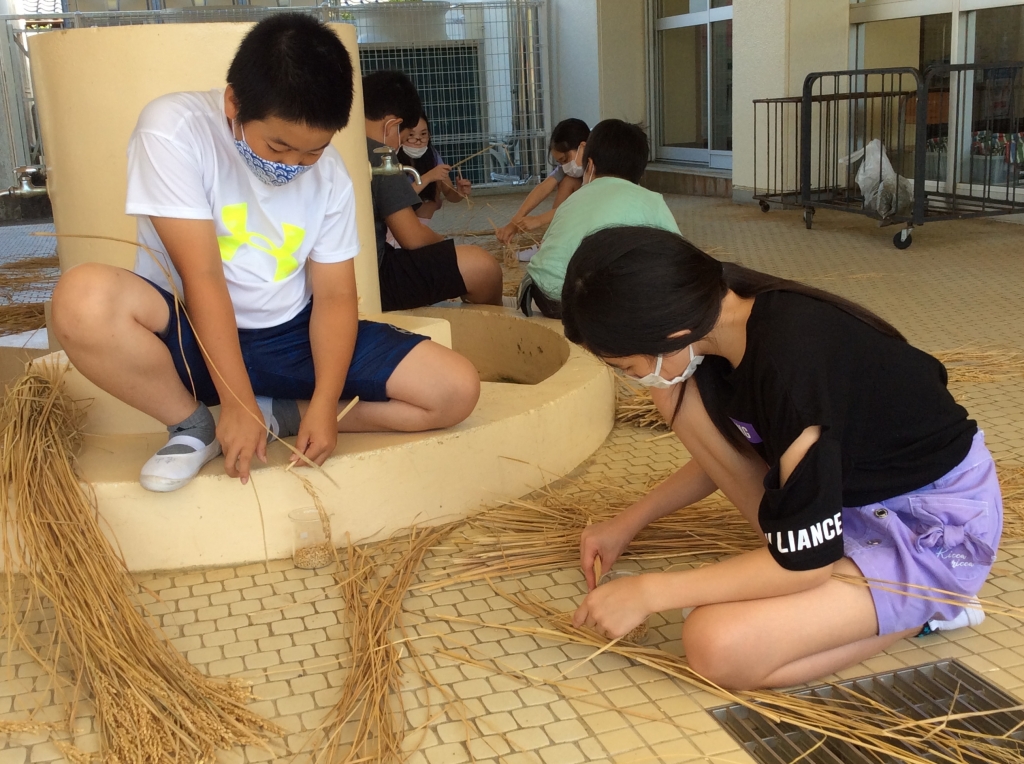 9月8日、5年生が総合の学習で稲の脱穀を体験しました。例年は、地域の米農家さんの協力で田植えや稲刈りを体験させていただくのですが、今年は実施が叶いませんでした。そこで、刈り取った稲を譲って頂き、ベランダで干した後、脱穀を行いました。穂を割りばしで挟みそっとひっぱると、きれいに籾がとれました。