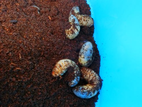 かまきりのたまごの中から出てきた、黒い虫の名前は「かまきりたまごかつおぶしむし」です。たまご中の幼虫を食べて大きくなる虫です。