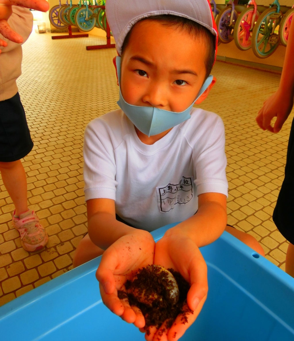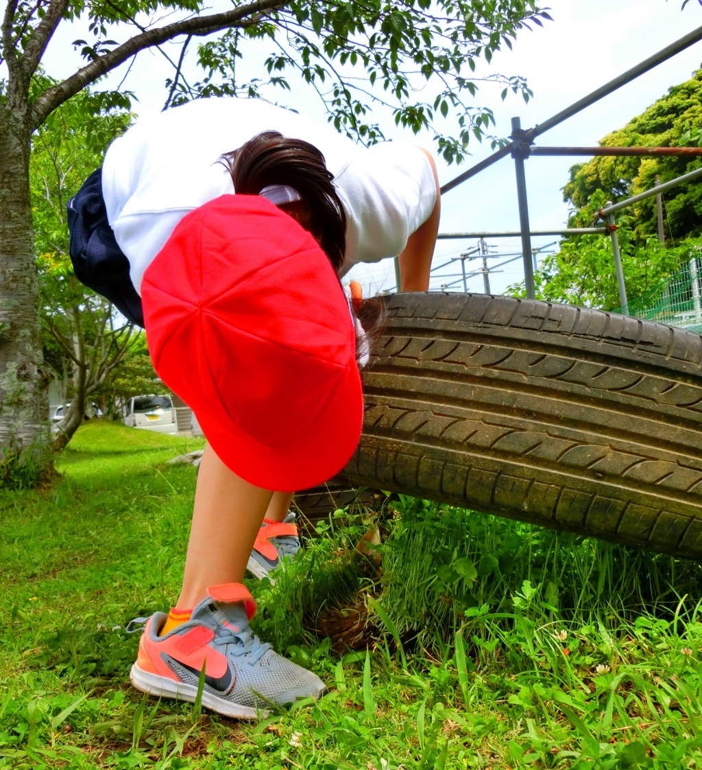 池のまわりやタイヤの下、どんな生き物がいるかな。「ヤゴを見つけたよ!」