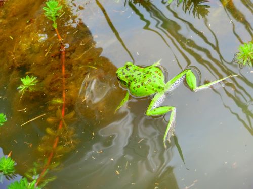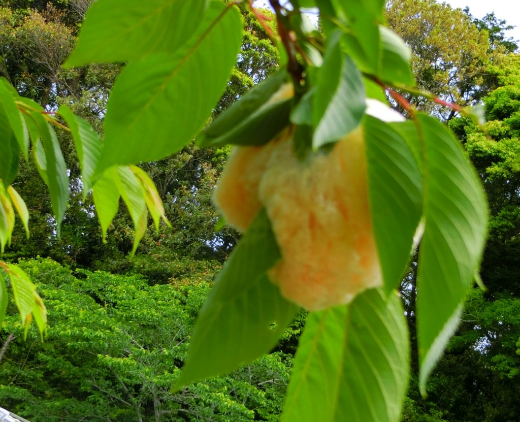 桜の木にモリアオガエルのたまごを発見しました。枝の下の池にはモリアオガエルが気持ちよさそうに泳いでいます。