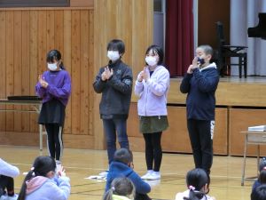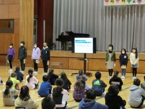 「新型コロナウイルスの感染拡大とインフルエンザの流行が心配される中、感染症予防をしっかりと行っていきましょう」と呼びかけ、手洗いやうがい、換気の大切さなどを発表しました。次に、正しい手の洗い方を『うえのしょう てあらいのうた』にのせて紹介しました。寒さが増し、空気も乾燥しています。みんなで感染症予防に努め、元気に過ごしましょう。