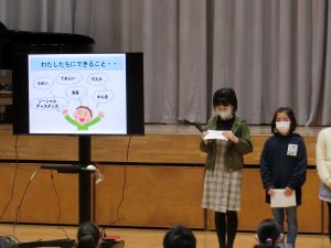 12月2日、全校朝会で保健委員会が「感染症の予防」について発表しました。