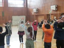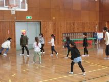 体験入学では、はじめに1年生との交流を行いました。自分たちで考えた「さんぽ」の振り付けを教えながら、みんなで楽しく踊った後、けん玉やおはじきなどの昔遊びを一緒に楽しみました。