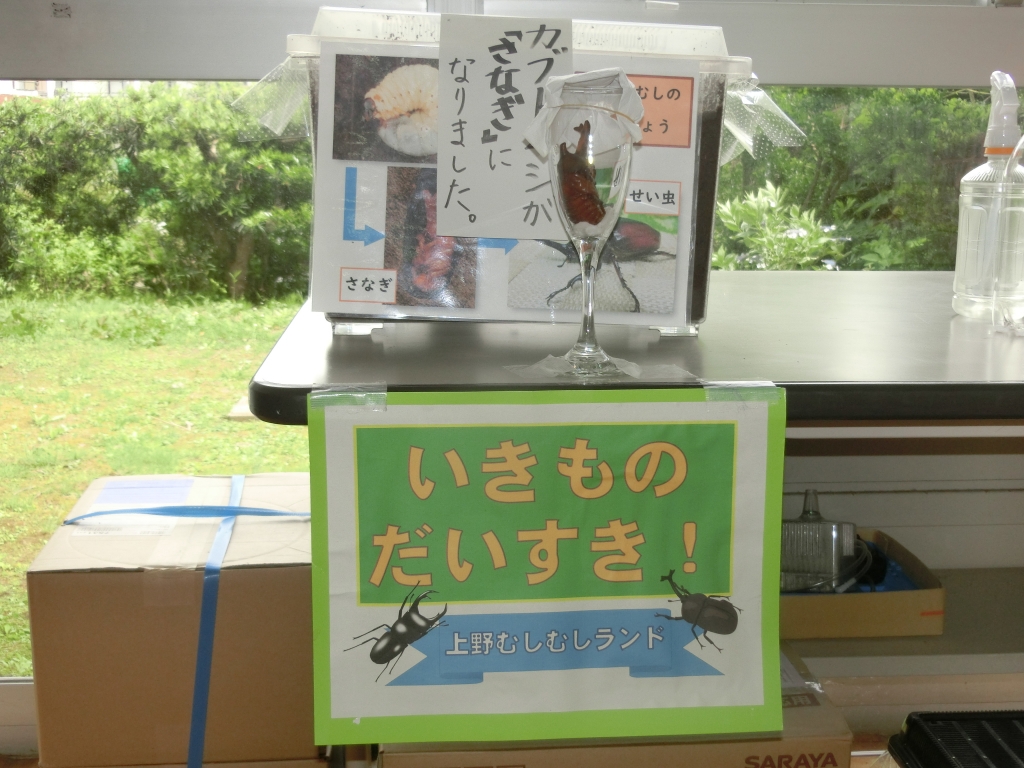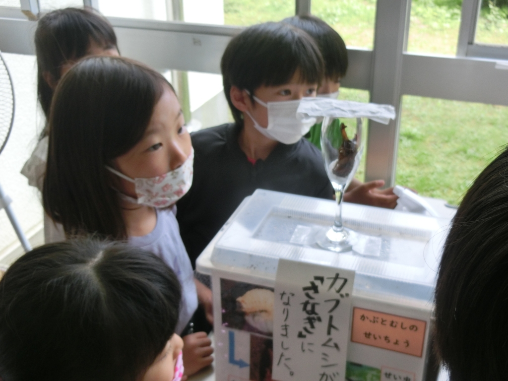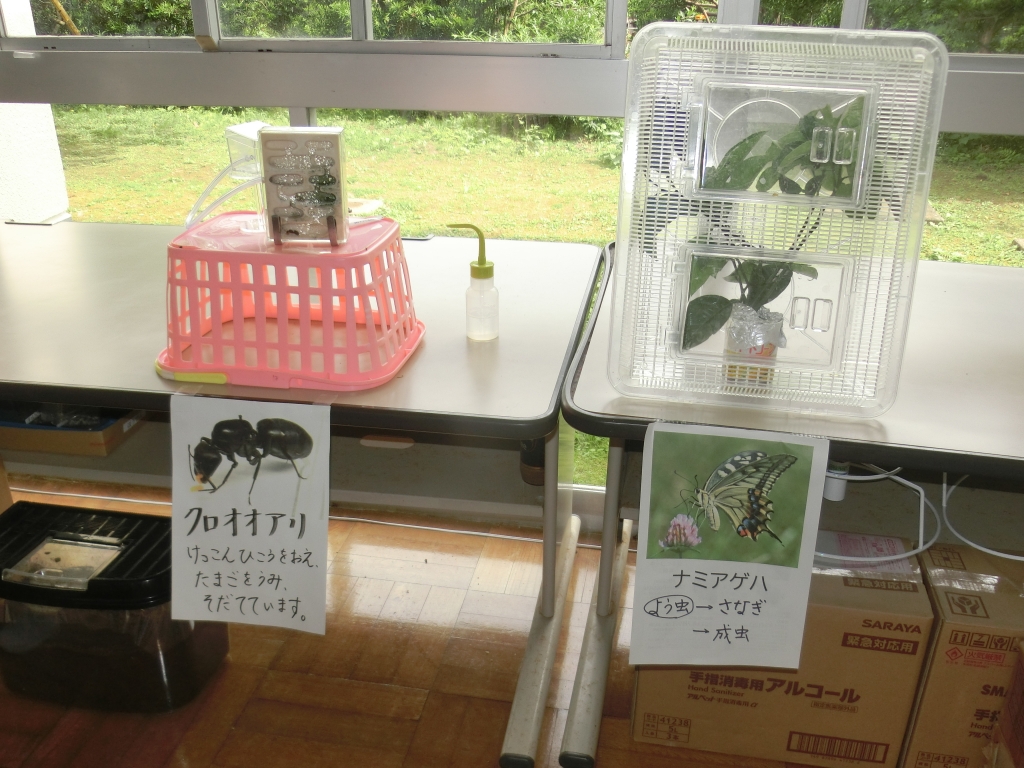 1階廊下の「生きもだいすきコーナー」には、いろいろな生き物を展示されていて、子どもたちは、毎日生き物の変化や成長を観察をしています。今は、クロオオアリやナミアゲハの幼虫に加え、カブトムシのさなぎが大人気です。