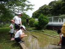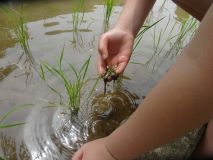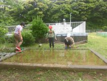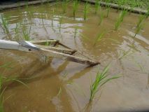 5年生は、稲の生長を楽しみに、毎日田んぼを見に行っています。先日は、田んぼの中に小さな草がたくさん生えているのを発見。早速、草取りをしました。手が届かないところは、とんぼで土を軽く動かすと、草が浮いてきました。稲は順調に育っています。