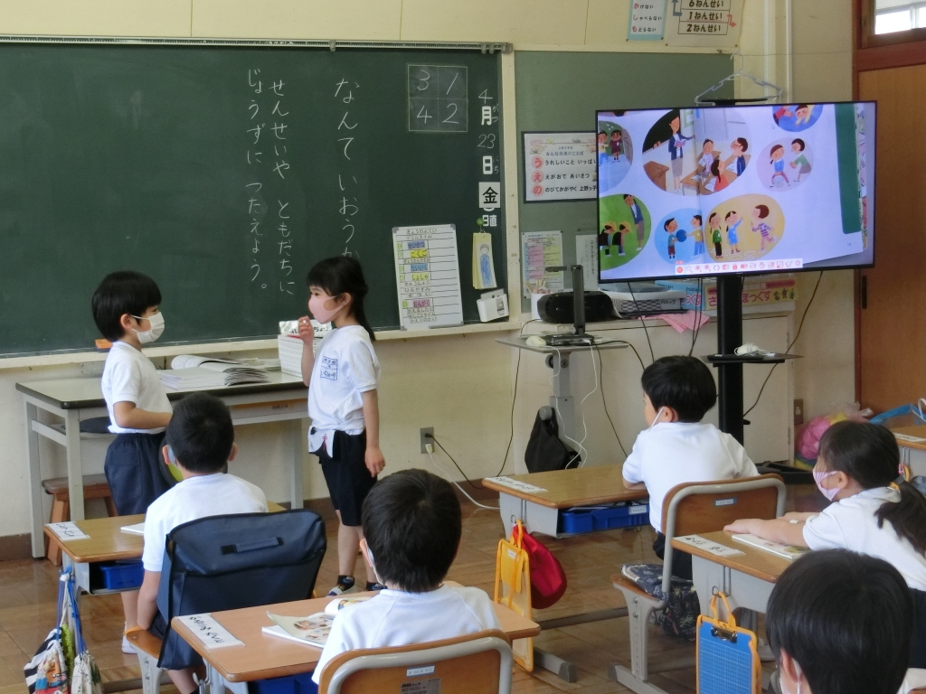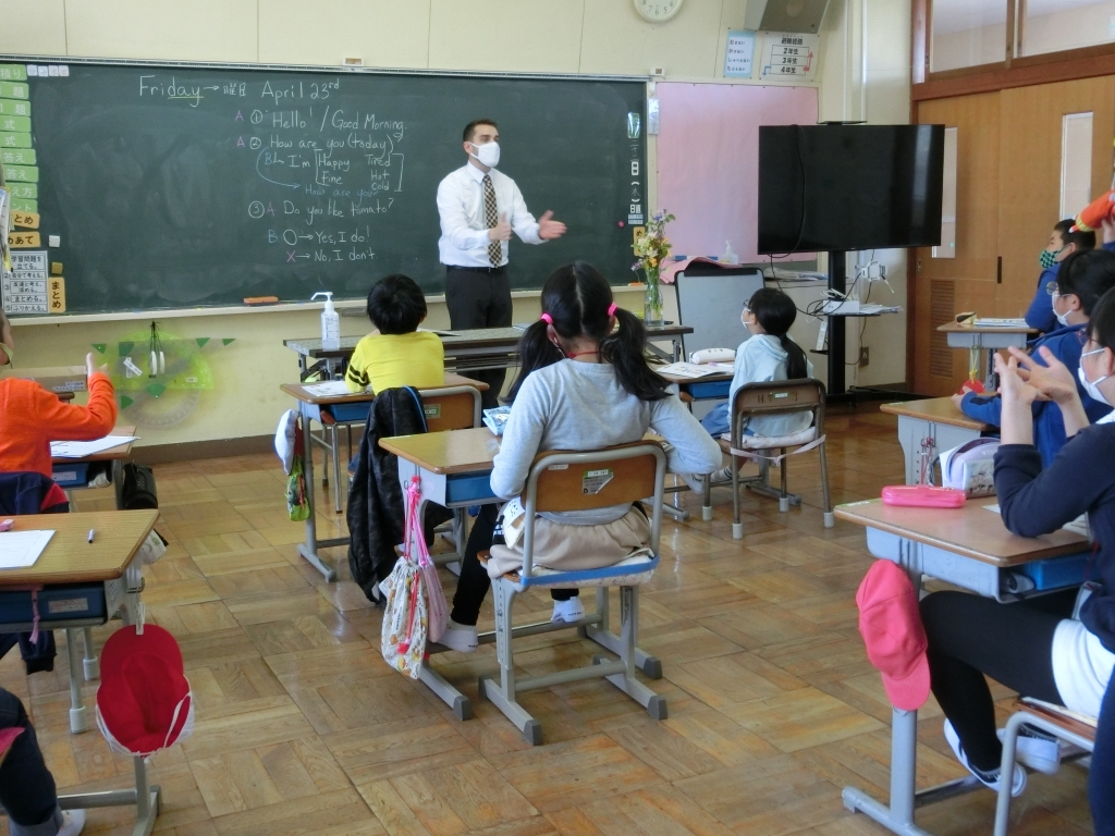 ジェスチャーをつけた元気なあいさつで授業がスタート。