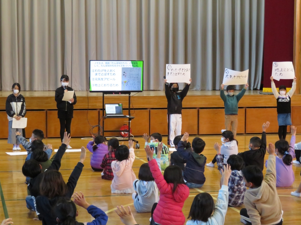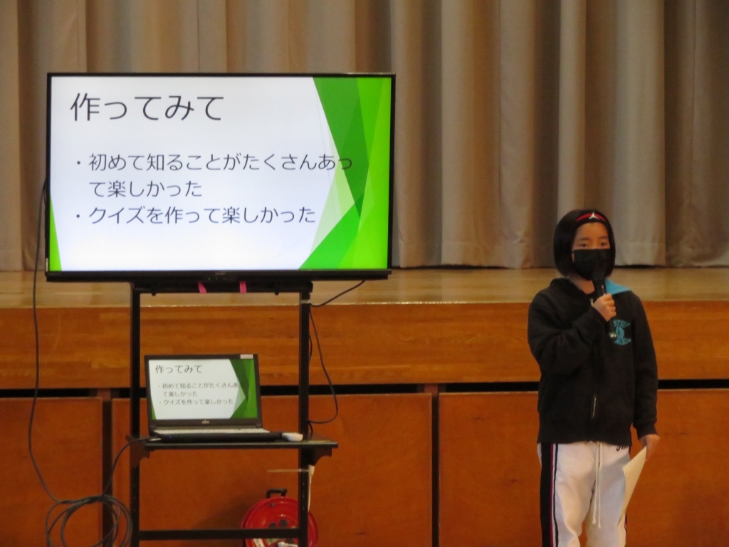 12月の委員会発表は放送委員会です。放送委員会では、各学年の教室を訪れ、学年で頑張っていることを取材しました。取り組みの様子を、作品の写真やインタビューしたことを交えながら、わかりやすく紹介しました。日ごろから、昼の校内放送を担当している放送委員のみなさんだけあって、アナウンサー顔負けの立派な発表でした。