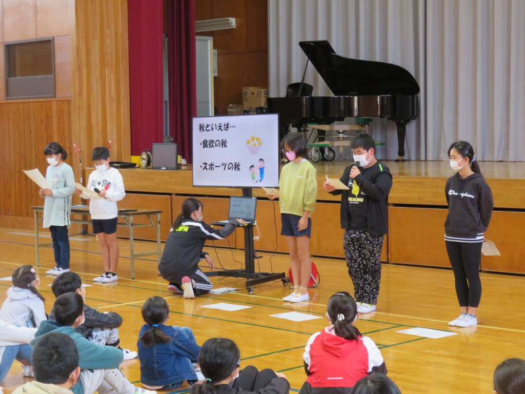 全校朝会で、図書委員会と保健委員会が発表しました。