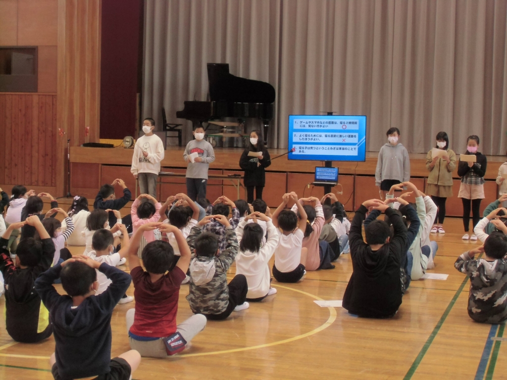 全校のみんなから寄せられた睡眠をとるための工夫を発表したあと、よい睡眠についてのクイズを出しました。たくさんの友達が全問正解しました。