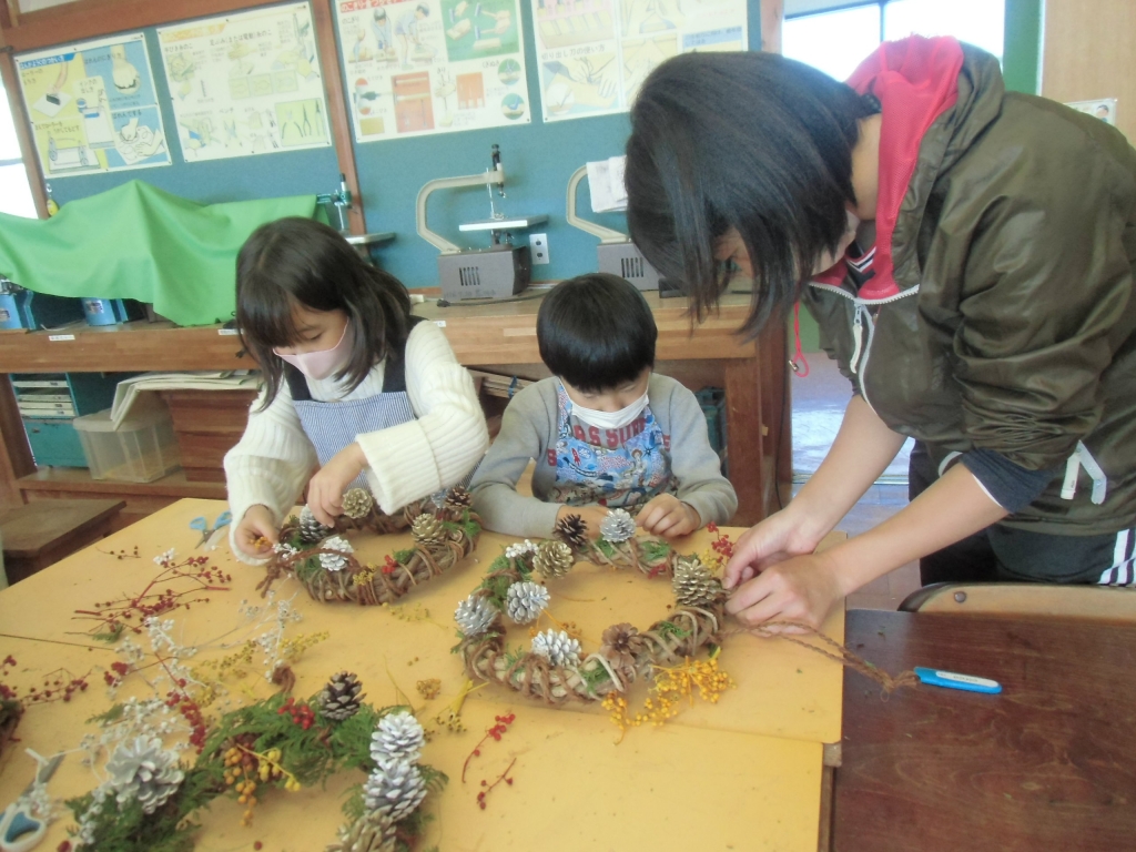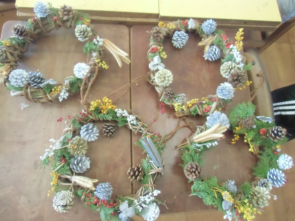 くずと藤のつるでつくったリースに、ひのきの葉やまつぼっくりなどで思い思いに飾り付けをしました。クリスマスが待ち遠しくなるような、すてきなリースが完成しました。