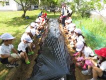 昨年もサツマイモを育てた2年生が、1年生に苗の植え方を教えました。1年生も、2年生にお手本をよく見て、丁寧に植えることができました。
