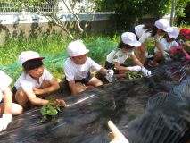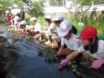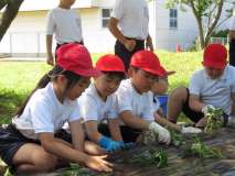 1,2年生が、校庭の畑にサツマイモの苗を植えました。