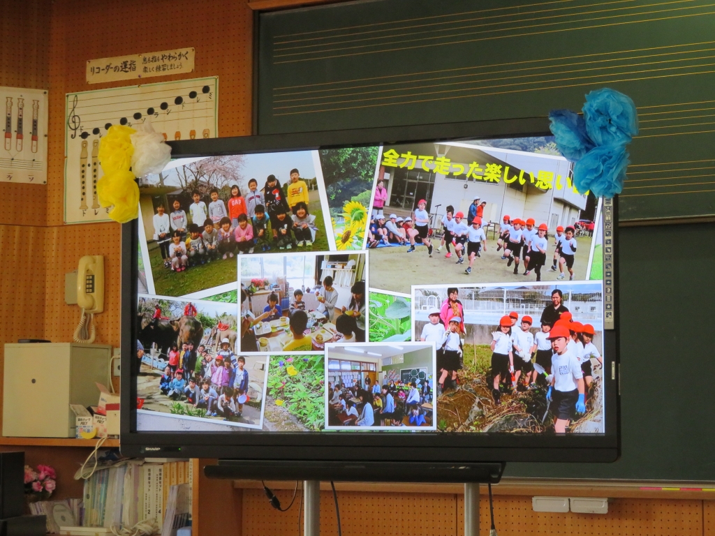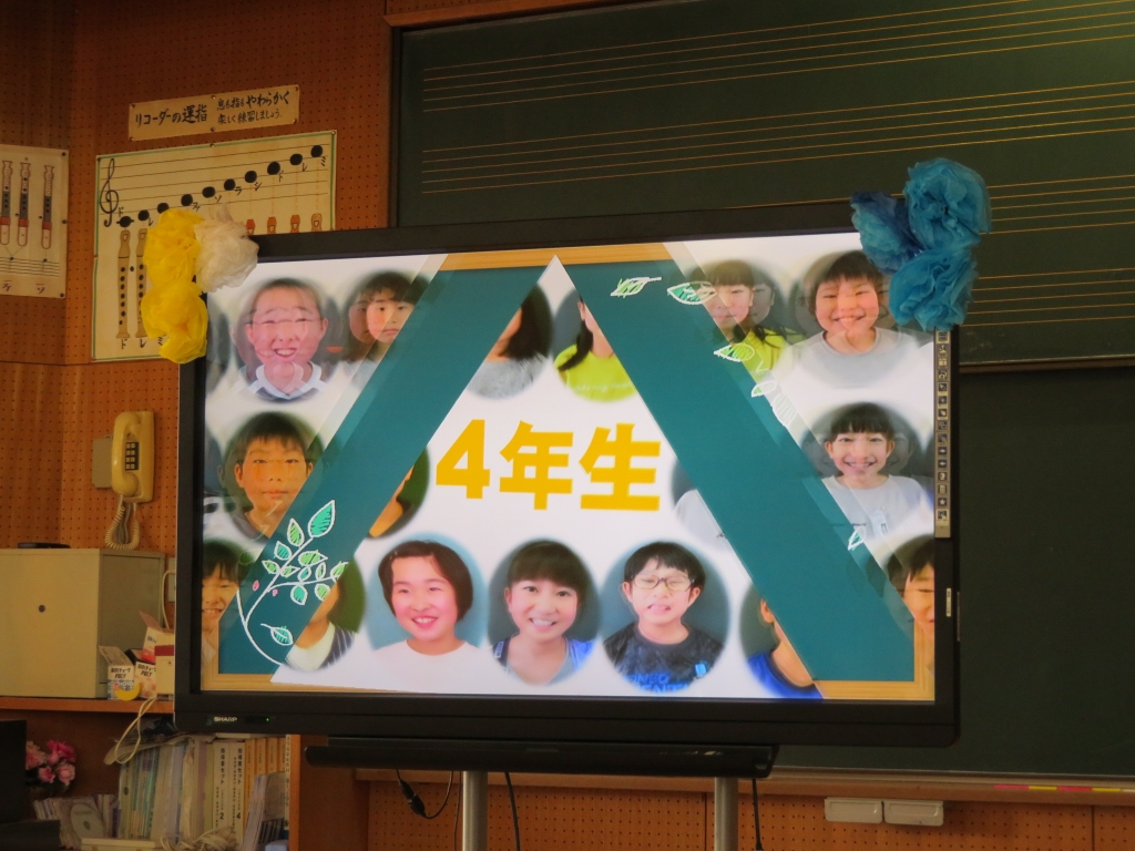 はじめに、これまでの成長を写真で振り返りました。次に、4年生が書いたアンケートをもとに、今の4年生の生活や好きなこと、勉強への取り組み方について発表しました。