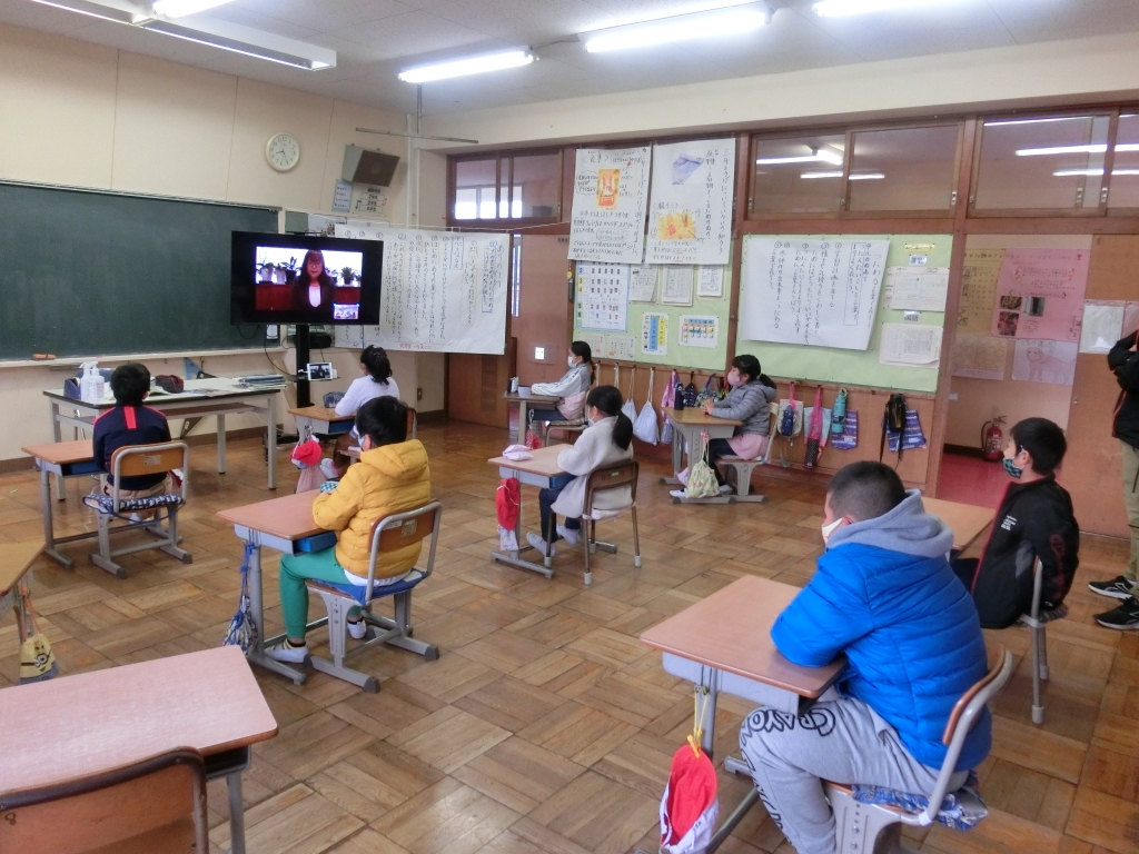 Web会議システムを使って、各教室と職員室、校長室をつなぎながら、校長先生のお話と、勝浦市小中学校書初展等の賞状伝達が行われました。