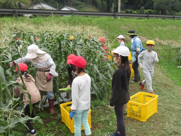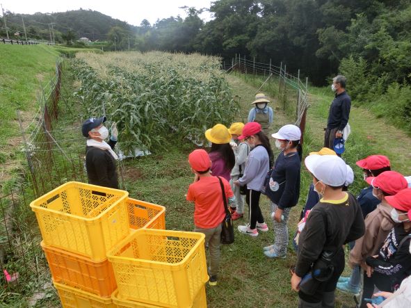 9月6日、「水土里の郷おおもり」の皆様のご協力をいただき、3年生がトウモロコシの収穫体験を行いました。6月に種をまいたトウモロコシは大きく生長し、立派な実をたくさんつけていました。