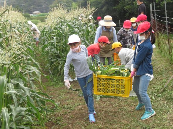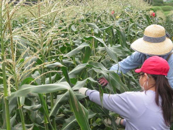 おいしい実の見分け方や、もぎ取り方を教えていただき、たくさんのトウモロコシを収穫しました。
