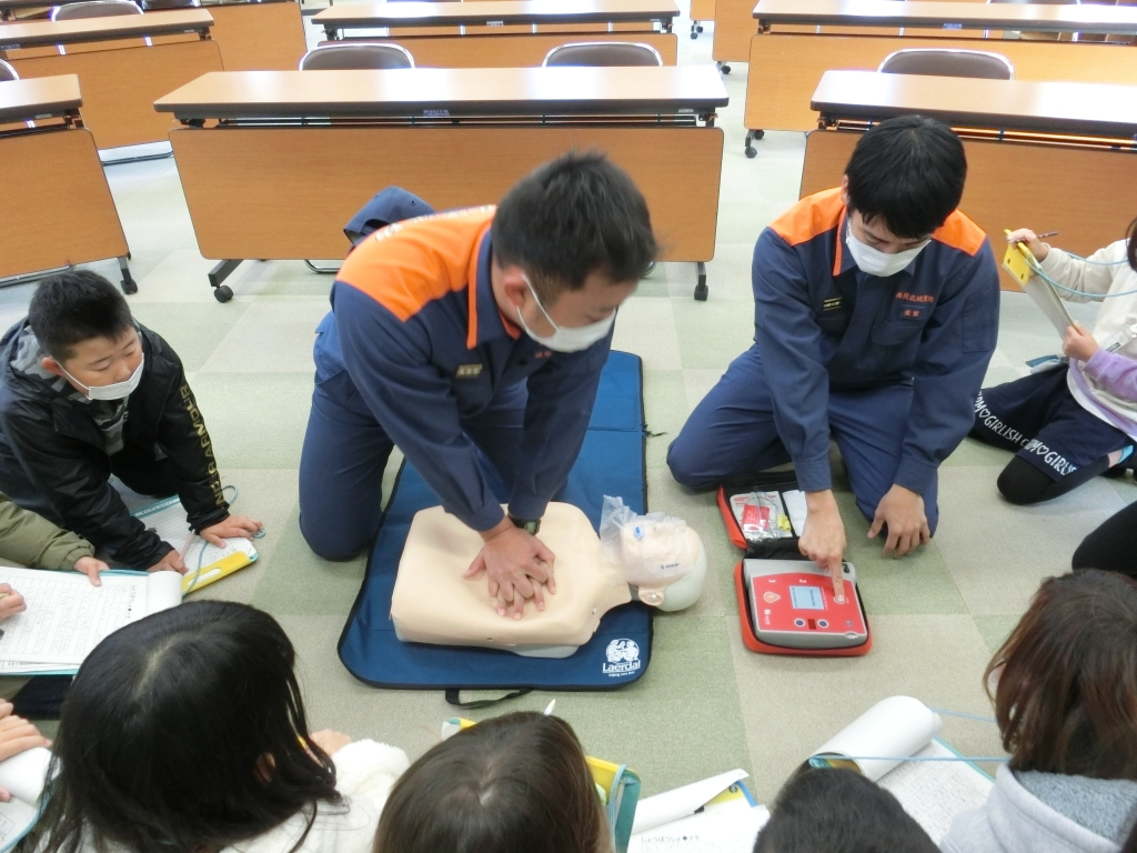 勝浦消防署では、施設や救急車、消防車などの見学に加え、救助や放水訓練の様子も見せていただきました。また、AEDの使い方も教えていただきました。