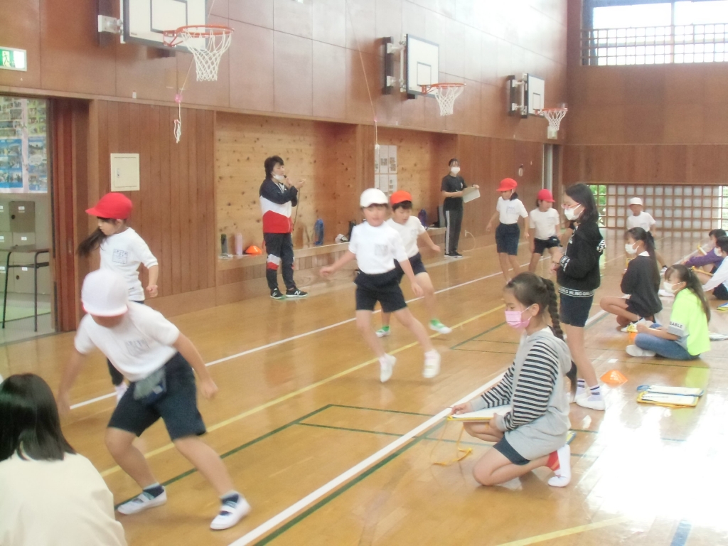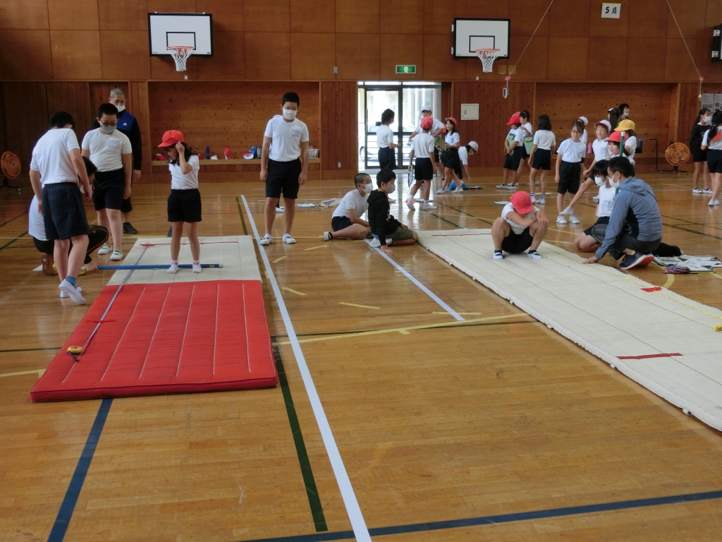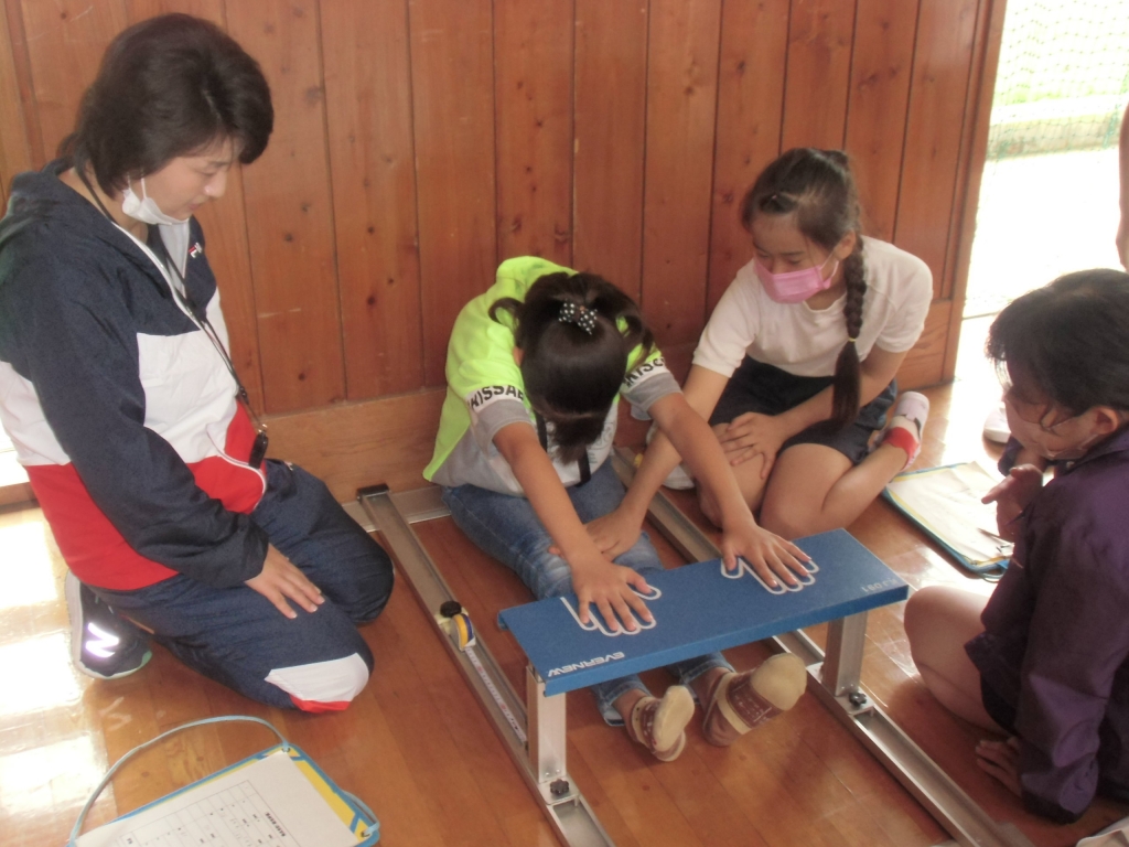 高学年に補助してもらいながら、反復横跳びや、立ち幅跳び、上体起こしなどに挑戦。みんな、昨年の記録を超えることを目標に、がんばっていました。