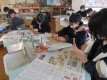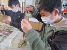 6年生は、理科の地層の学習で、海や川で堆積した土や砂の中に化石ができるしくみを学習しました。ここでは、層になった岩の中から、化石を見つける体験活動を行いました。丁寧に慎重に岩を削っていくと、葉っぱや木の実の化石を見つけることができました。