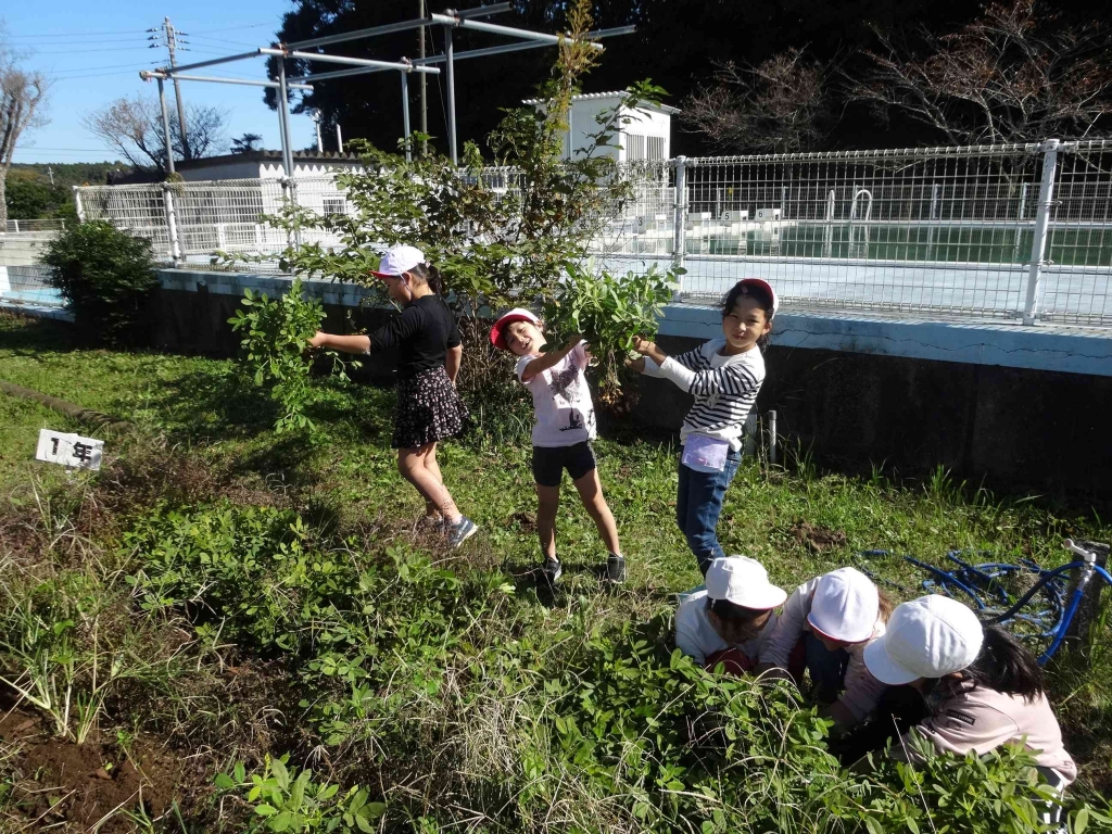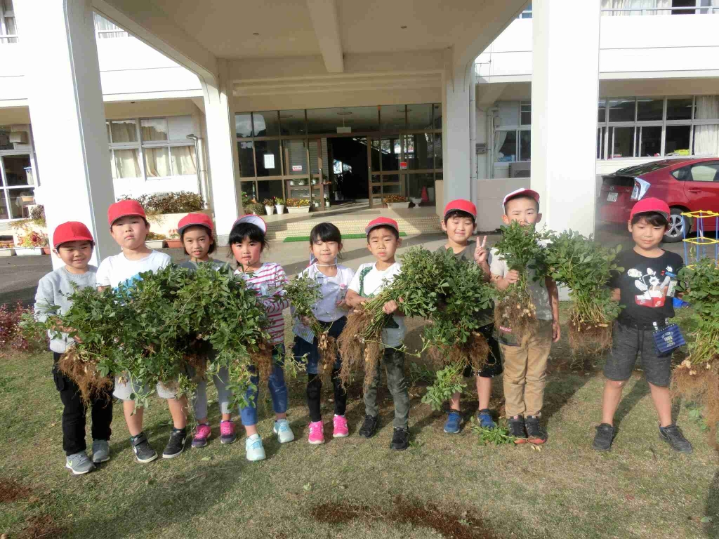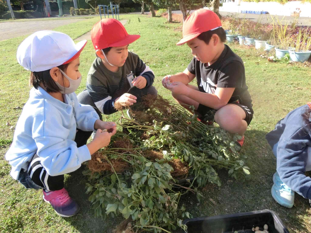 1,2年生が、畑で育てていた落花生を収穫しました。