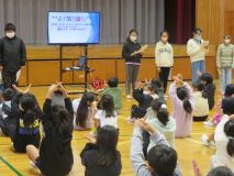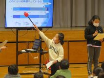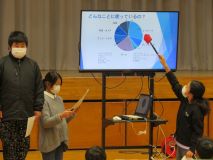 12月の全校朝会では、保健委員会から「スマホやゲームの使い方」について発表がありました。全校アンケートの結果から、本校では学年が上がるほどスマホやゲームの使用時間が増えていることや、休日は長い時間ゲームや動画視聴をする人が多いことなどが報告されました。そして、長時間スマホやゲームをやり続けると、心と体に不調が現れ生活リズムが崩れることや、ゲーム依存症の恐ろしさについて説明がありました。健康委員会からの「家の人と、スマホやゲームの使い方を話し合い、約束を守って使うようにしましょう」という呼びかけを、みんな真剣な表情で聞いていました。